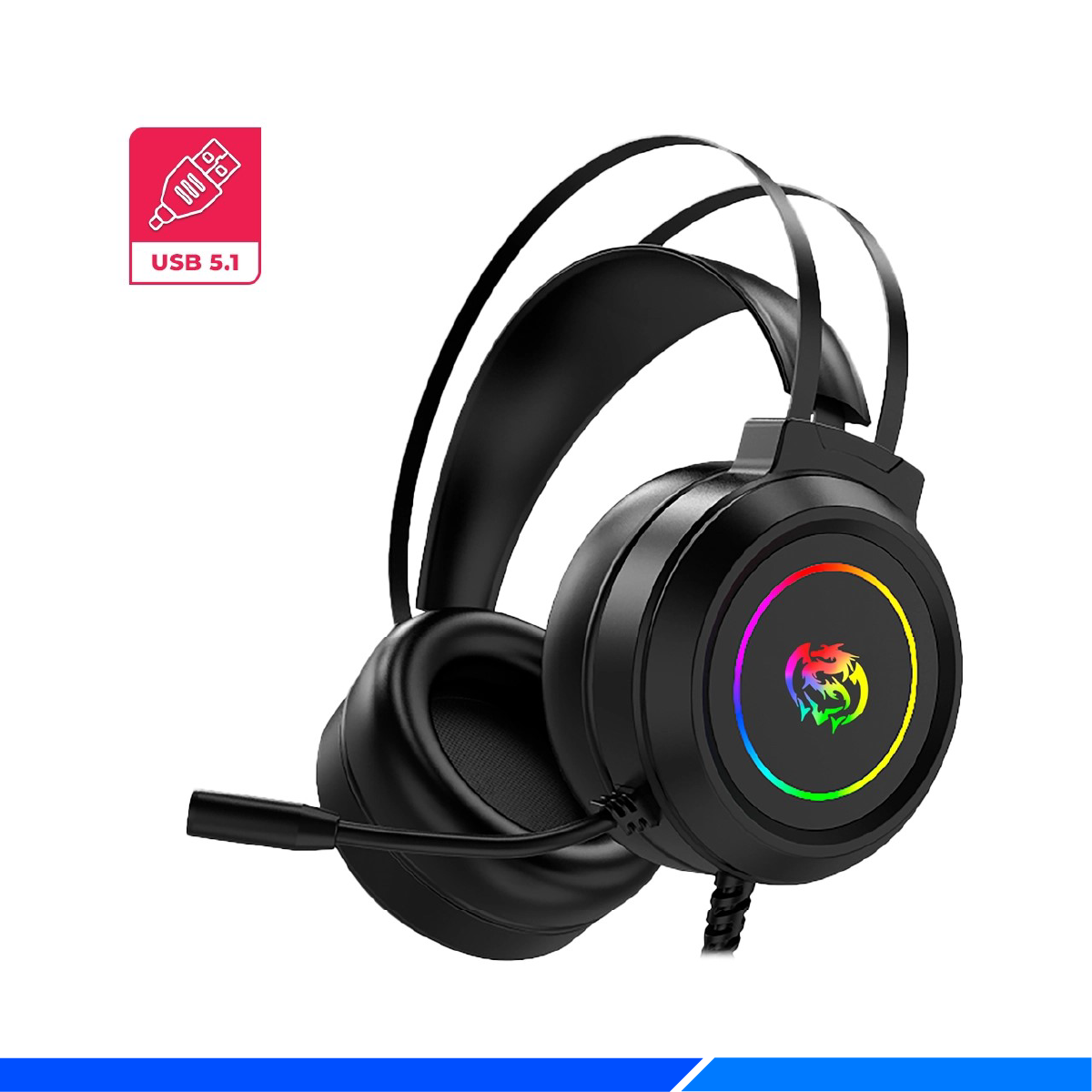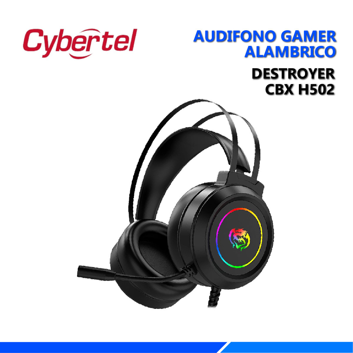 Audífonos gaming Destroyer CBX H502 con sonido envolvente 7.1, iluminación RGB y micrófono flexible. Control de volumen en orejera y cable trenzado de 2m.