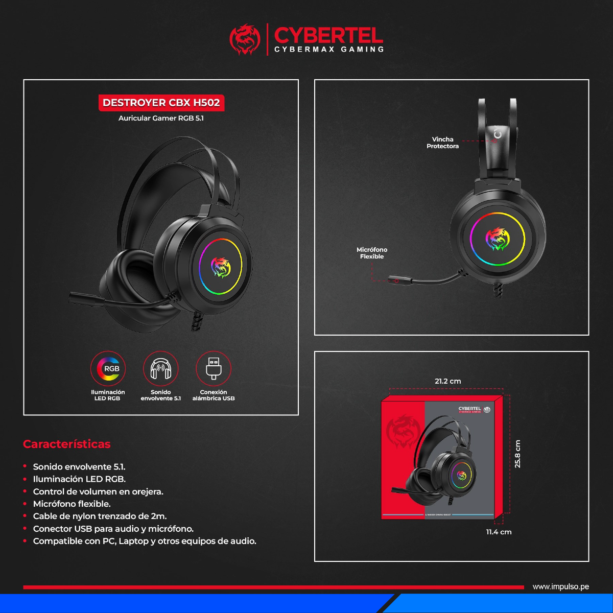 AUDÍFONO CYBERTEL DESTROYER CBX H502 7.1 USB RGB