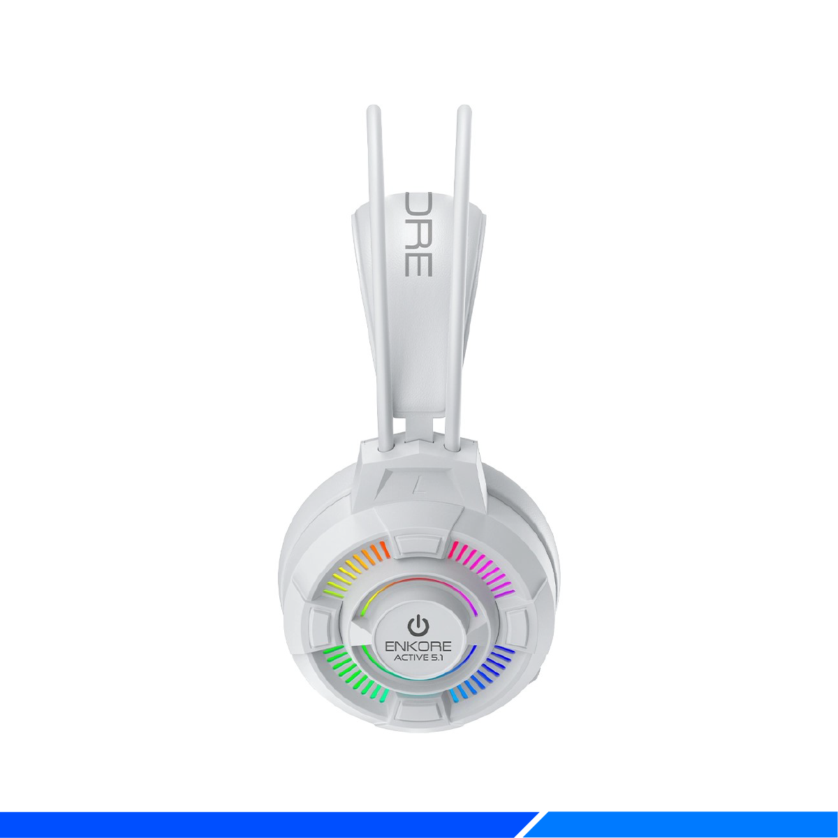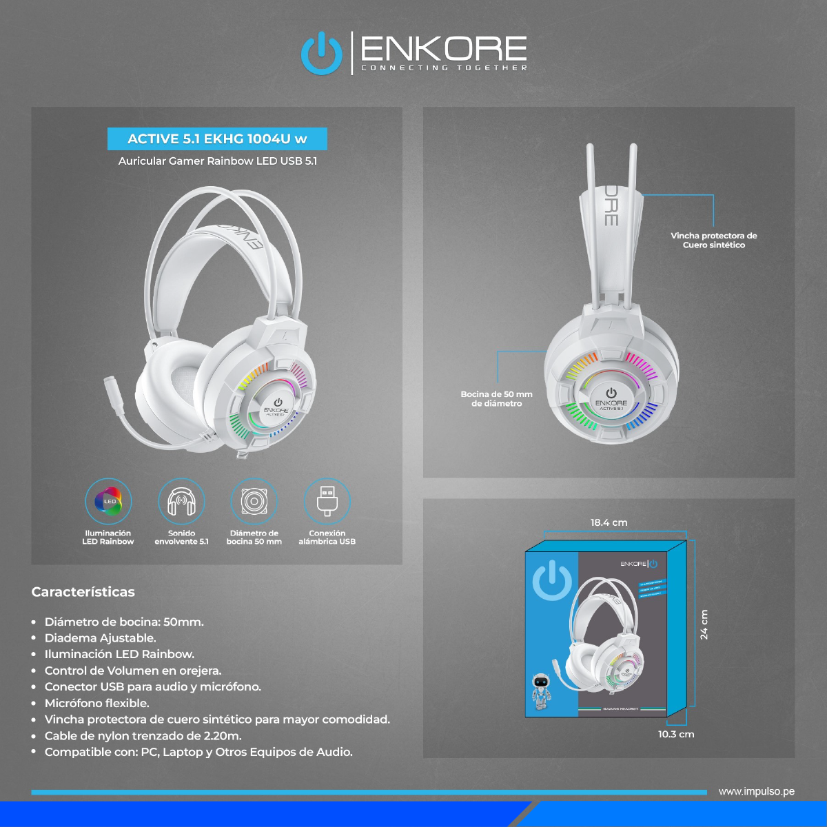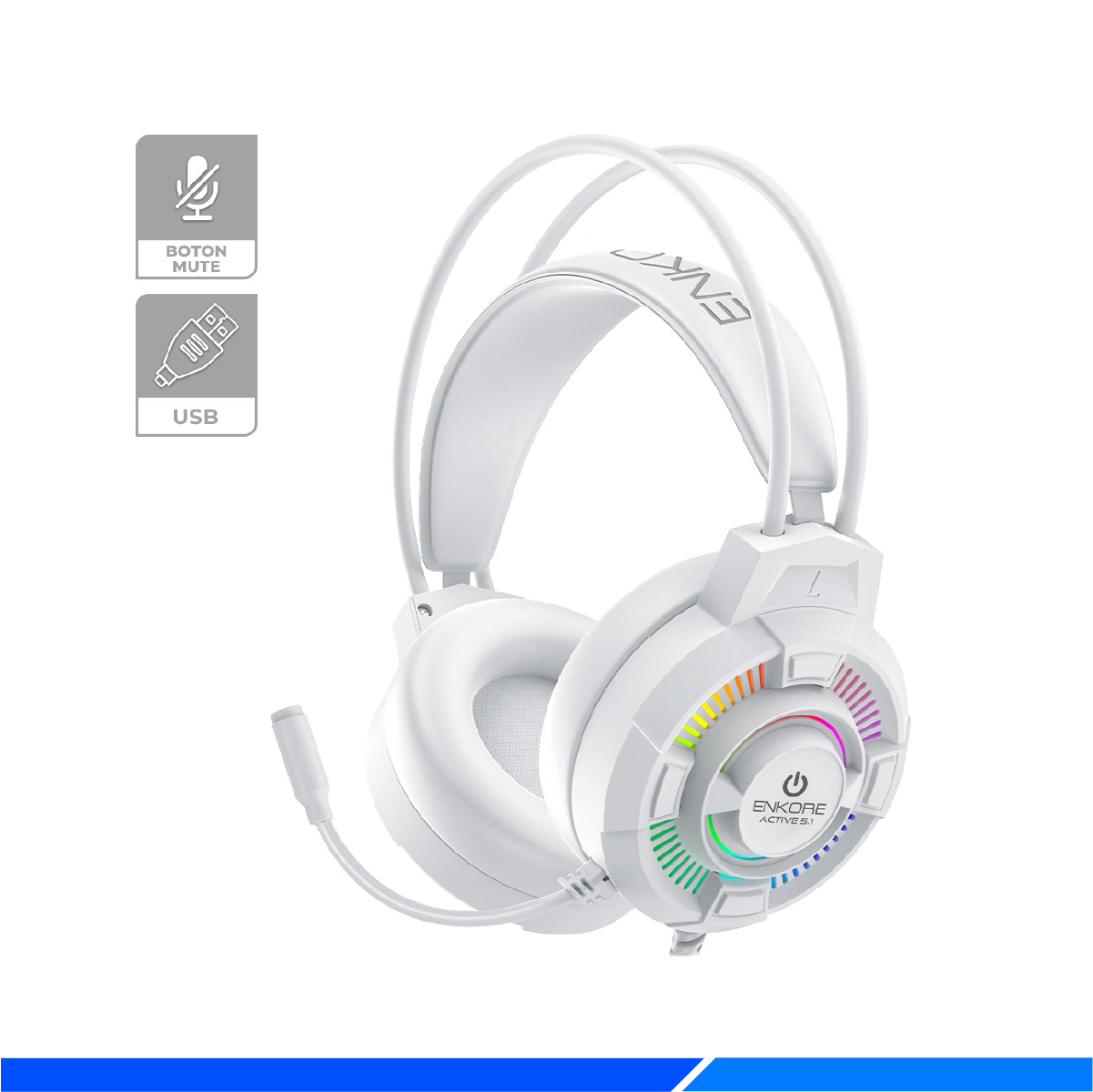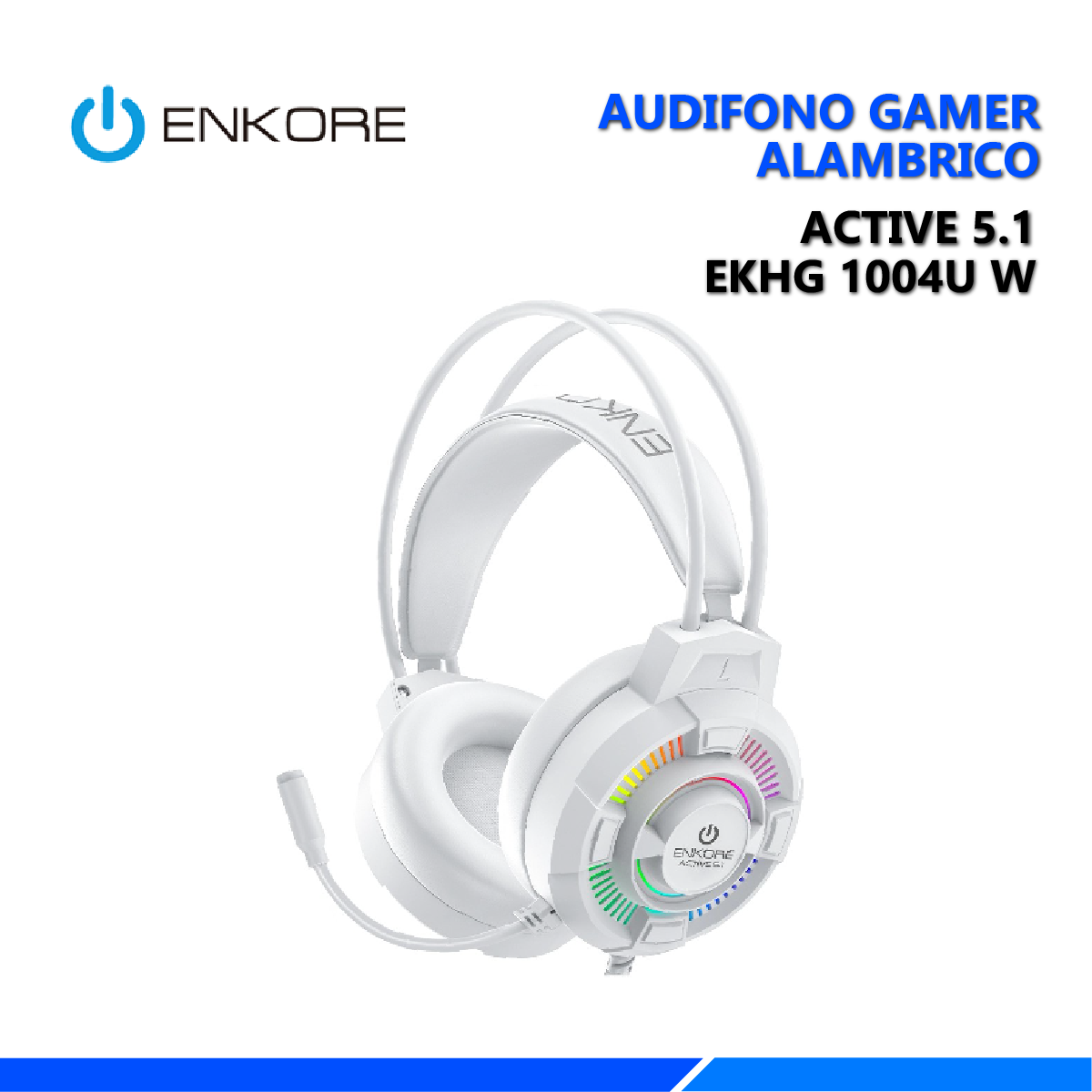 Destaca tu setup gaming con el Active 5.1 EKHG1004U W, unos audífonos gaming en elegante color blanco que combinan sonido envolvente de alta calidad y espectacular iluminación Rainbow LED. Diseñados para gamers que buscan rendimiento excepcional y estética premium, ofrecen una experiencia de audio inmersiva con un diseño que llama la atención.