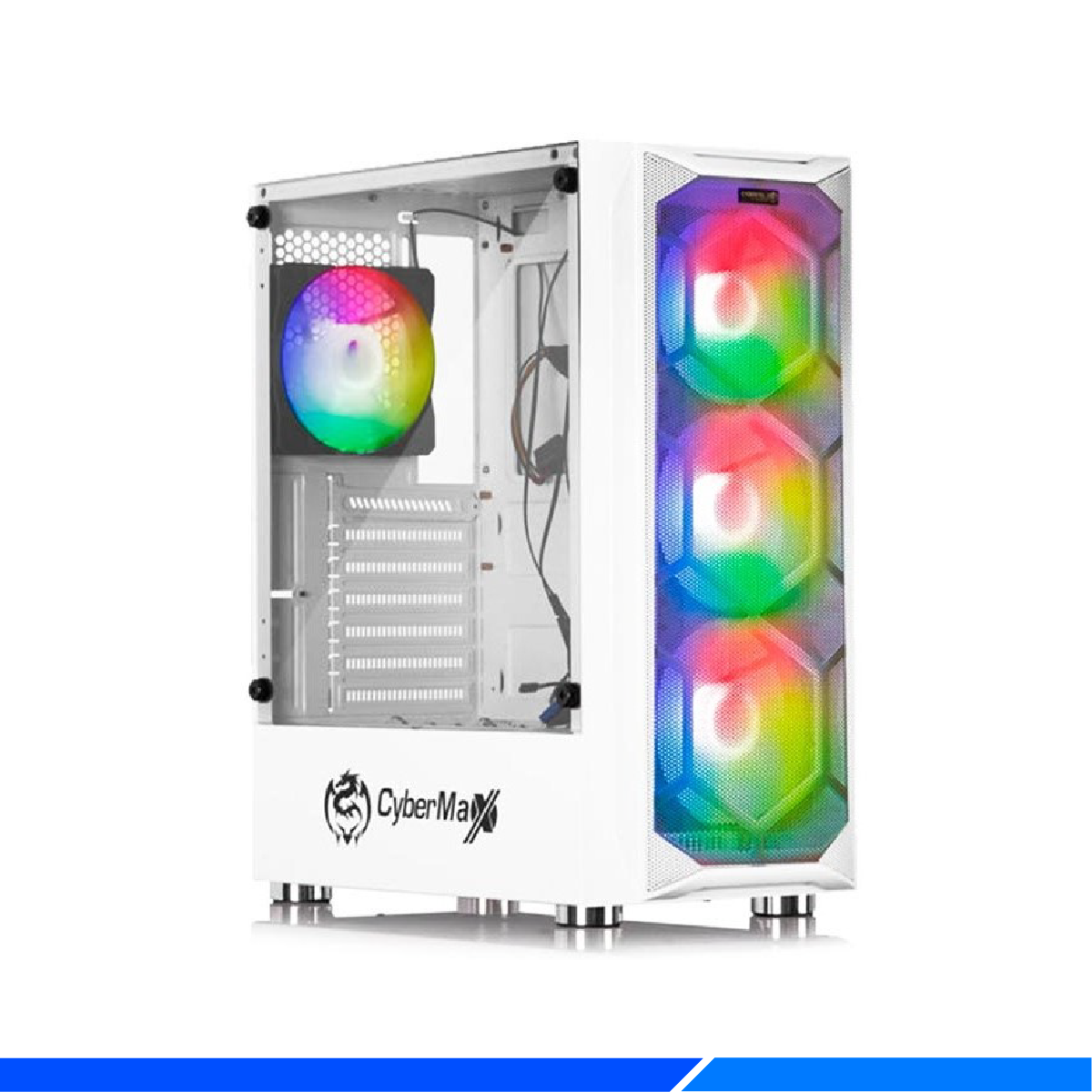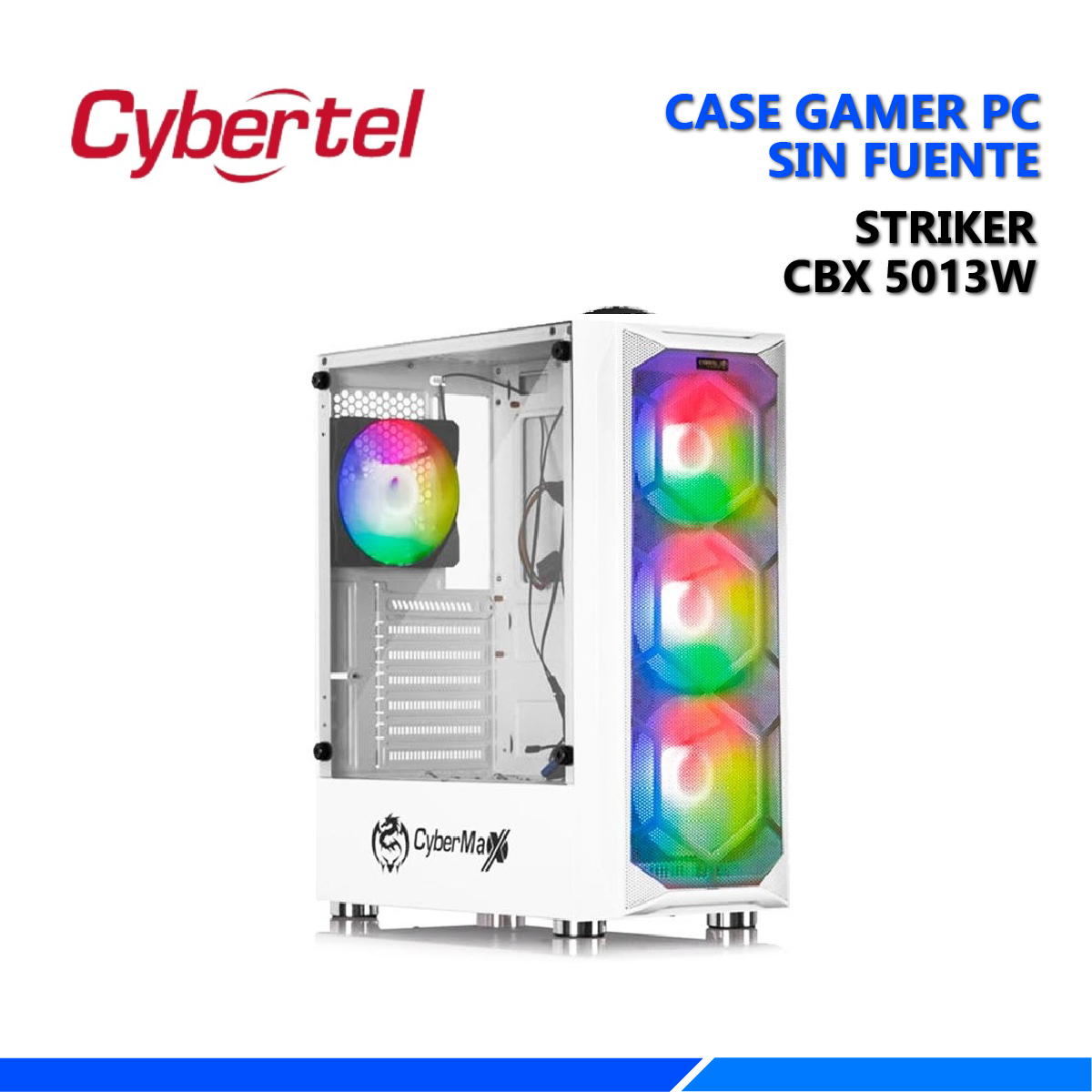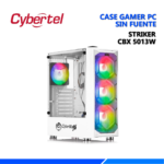 Destaca tu build gaming con el Striker CBX 5013W, un case gaming en elegante color blanco que combina diseño premium y funcionalidad avanzada. Su panel lateral de vidrio templado proporciona una vista espectacular de tus componentes internos, mientras que los 4 ventiladores LED RGB incluidos crean efectos de iluminación dinámicos que contrastan hermosamente con el diseño blanco limpio.