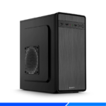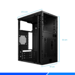 El sistema de ventilación incluye 1 cooler de 8cm incluido con soporte para ventiladores adicionales de 12cm opcionales en posición lateral. Las bahías internas ofrecen flexibilidad de almacenamiento con 1 bahía de 3.5″ para HDD y 2 bahías de 2.5″ para SSD.