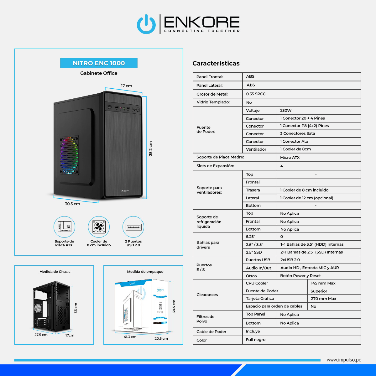 Construye tu sistema computing eficiente con el Nitro ENC 1000, un case compacto que combina diseño funcional y fuente de poder integrada. Equipado con una fuente de 230W reales que incluye múltiples conectores para alimentar tu sistema básico, es la solución perfecta para builds de oficina, multimedia y gaming casual.