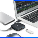 HUB portátil USB 3.0 con 4 puertos de alta velocidad. Diseño compacto y práctico, ideal para conectar múltiples dispositivos simultáneamente.